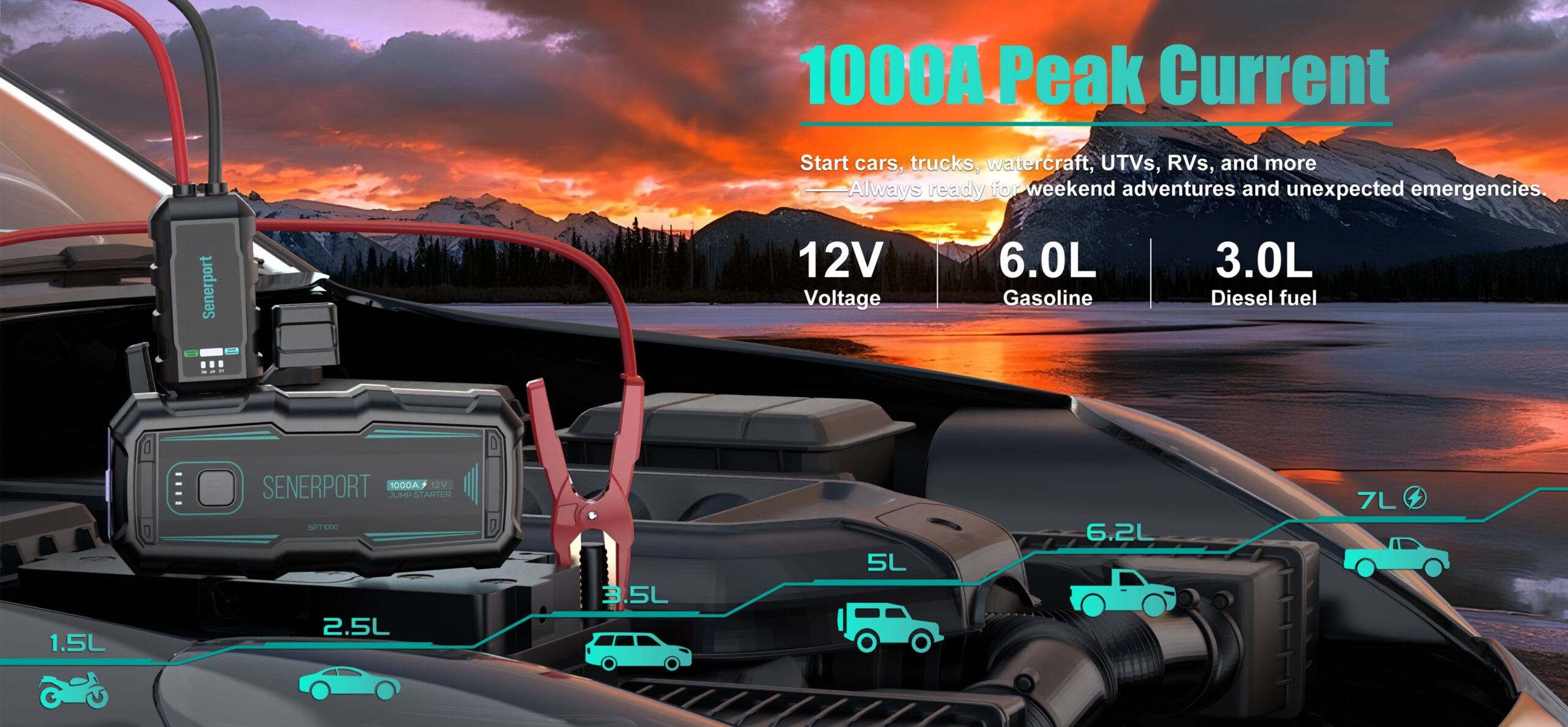 The SPT1000 Smart Jump Starter delivers 1000A of peak power to jump-start 12V vehicles (gas engines up to 5L, diesel up to 4L) in seconds. Its IP54-rated rugged design resists water, dust, and drops up to 2 meters.