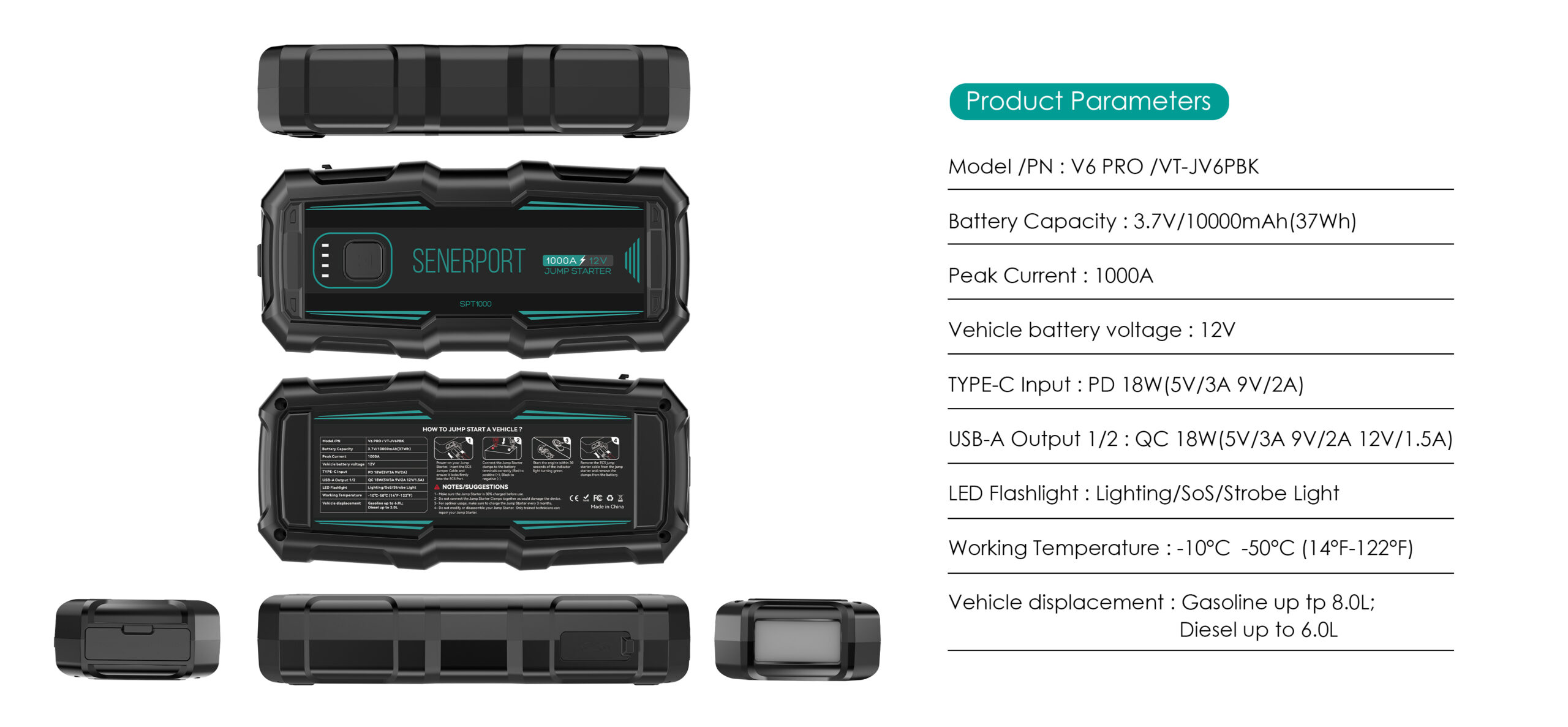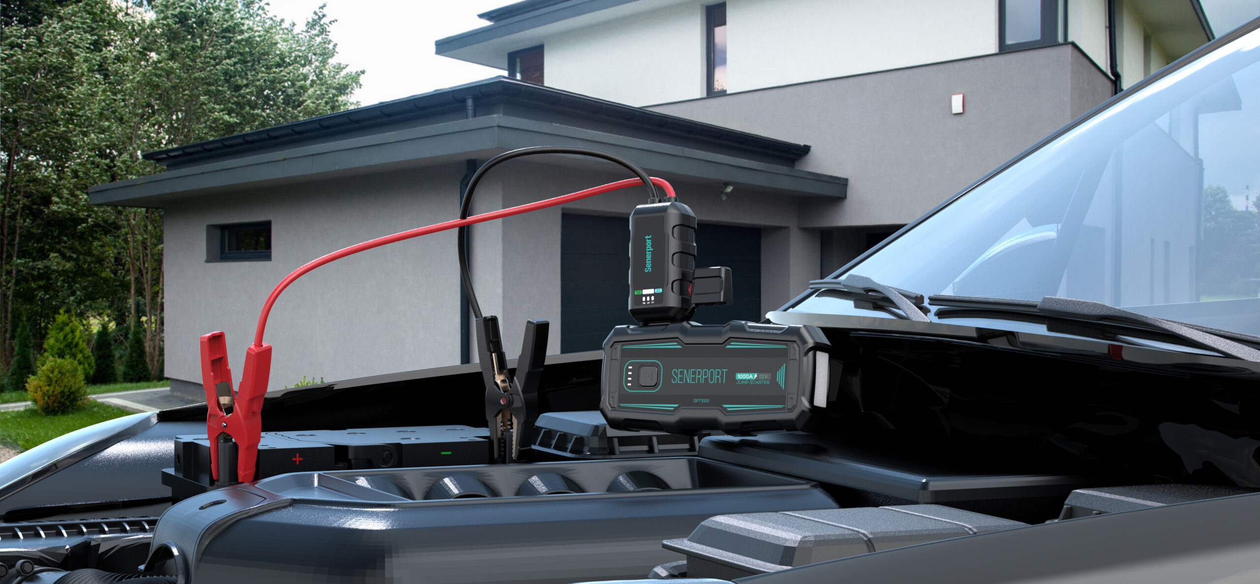 The SPT1000 Smart Jump Starter delivers 1000A of peak power to jump-start 12V vehicles (gas engines up to 5L, diesel up to 4L) in seconds. Its IP54-rated rugged design resists water, dust, and drops up to 2 meters.