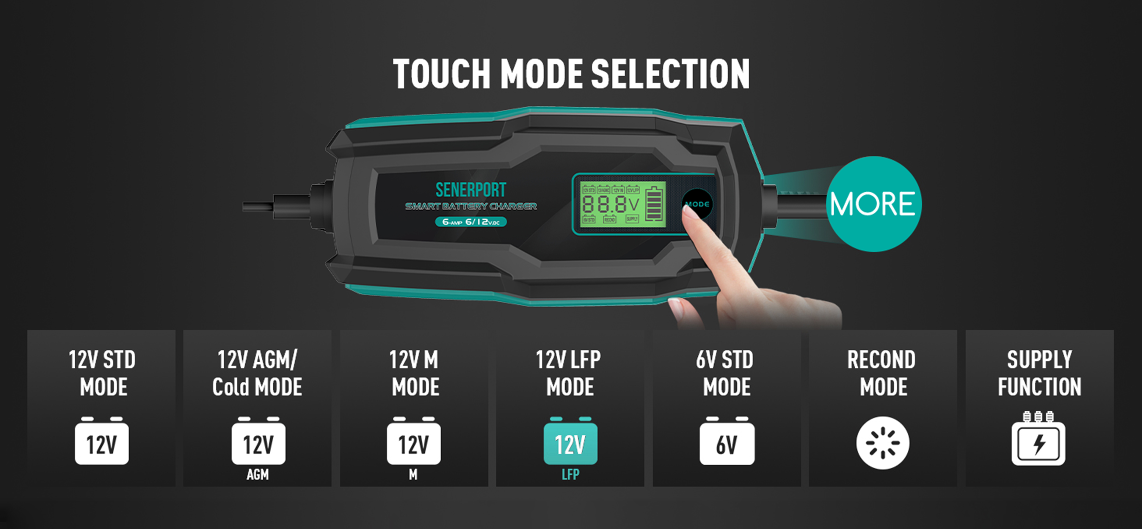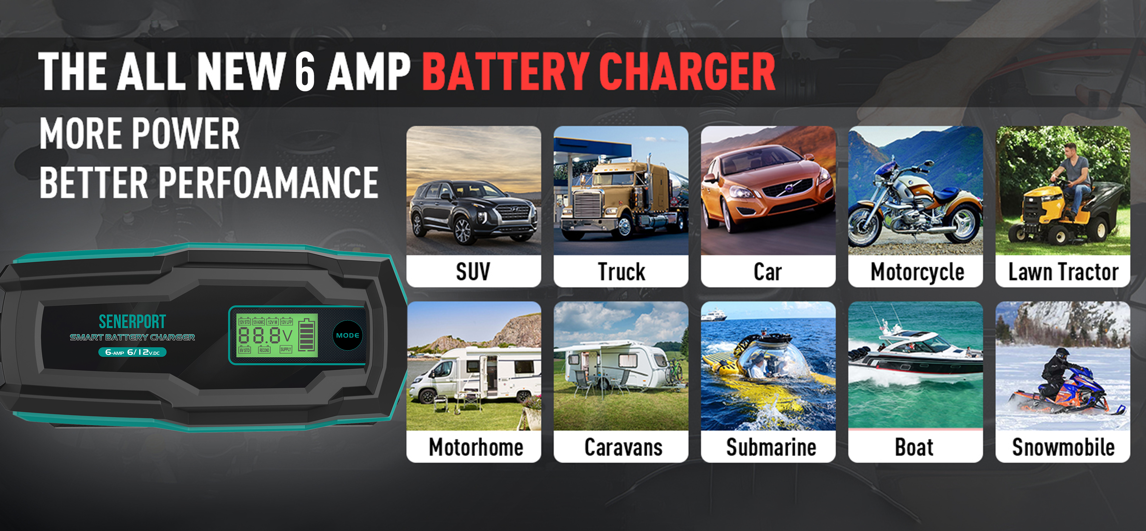 The SBC1006 Smart Battery Charger is compatible with all types of 6V/12V Lead-Acid Battery &12V LiFePO4 Battery, Max. output 6A for smart charging.
